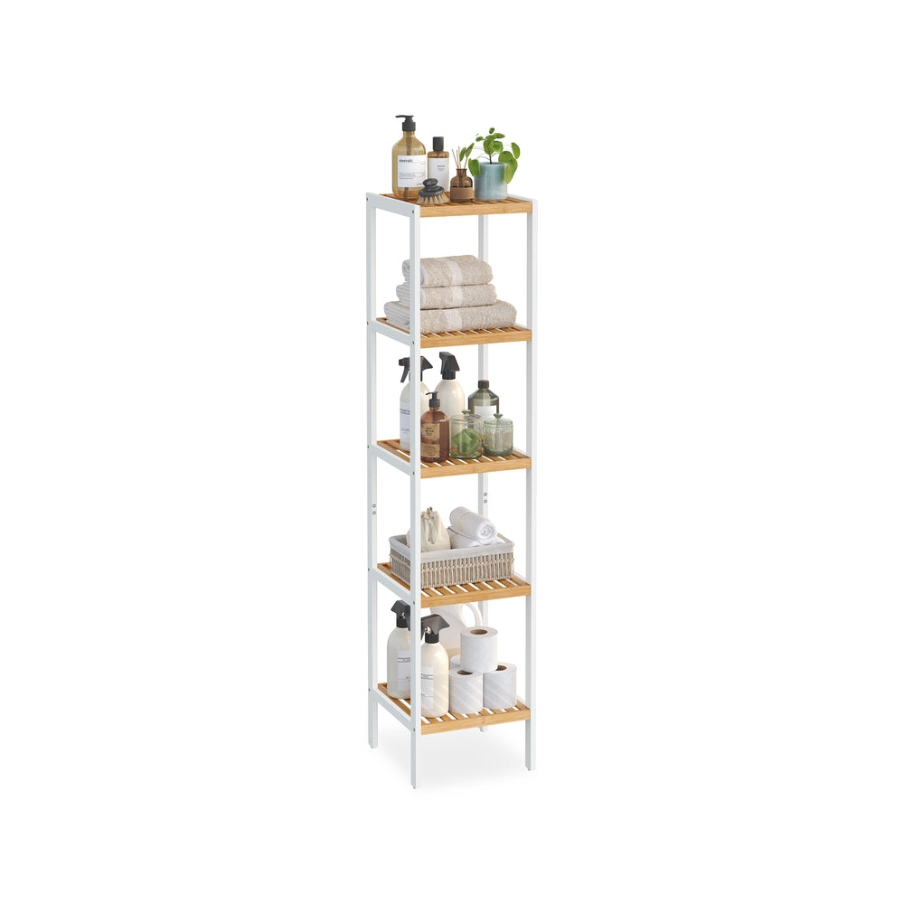 Étagère de Salle de Bain à 5 Niveaux en Bambou Blanc Nuage et Beige Naturel