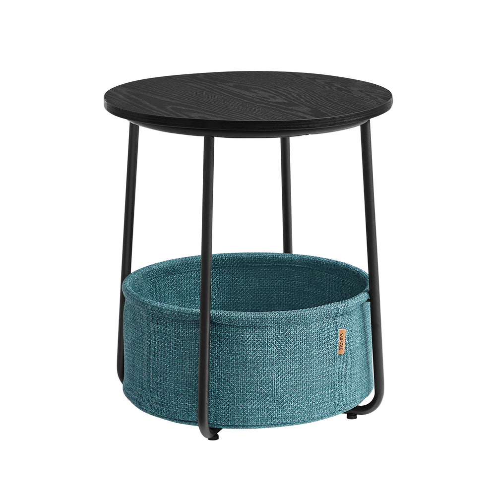 Ronde salontafel met beboste zwarte en donkerturquoise mand