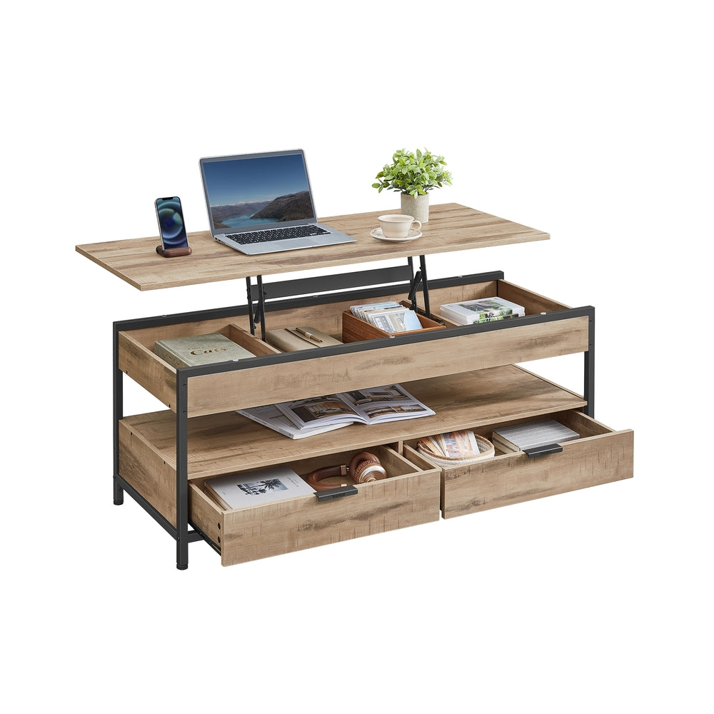 Table basse avec plateau relevable tiroirs de rangement marron camel et noir d'encre